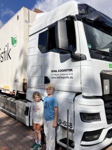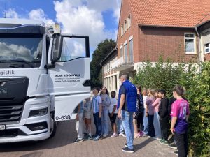 Herr Dick von der Firma Boll Logistik fuhr mit seinem großen LKW auf den Schulhof. Die Kinder durften erleben, wie sich eine komplette Schulklasse im „Toten Winkel“ verstecken kann.